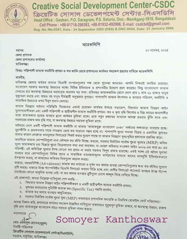 শক্তিশালী তামাক করনীতি প্রণয়ন ও কর ফাঁকি রোধে প্রশাসনের কার্যকর পদক্ষেপ গ্রহণের দাবিতে মানববন্ধন শেষে জেলা প্রশাসকের নিকট স্মারকলিপি প্রদান করে ক্রিয়েটিভ সোসাল ডেভেলপমেন্ট সেন্টার বা সিএসডিসি। মানিকগঞ্জের সাটুরিয়া উপজেলার দড়গ্রামে এ মানববন্ধন অনুষ্ঠিত হয়। ২৭ নভেম্বর অনুষ্ঠিত মানববন্ধনে বক্তারা বিস্তারিত..